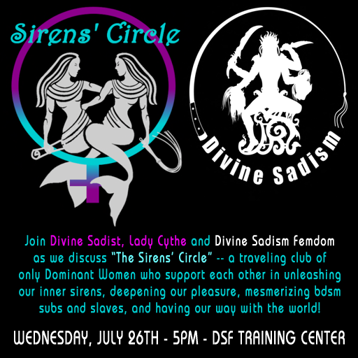The Sirens’ Circle is a traveling club, of only Dominant Women, that support each other in unleashing Our inner Sirens, deepening Our pleasure, mesmerizing BDSM subs and slaves, and having Our way with the world!