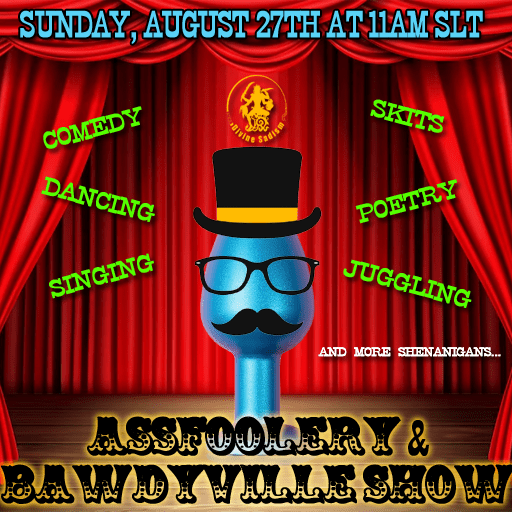 The Assfoolery & Bawdyville Show will feature DSF slaves and chattel, baring their bottoms and other talents on the Divine Sadism stage.