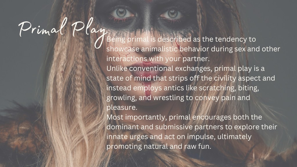 I know I am biased but I think that is pretty hot. But here’s the cool part about my dynamic that I very seldom hear talked about and is one of the most erotic and spiritual experiences I have ever had, dominant on dominant primal play. Where we both enter the scene as hunter and hunted. It is a raw and fierce energy like nothing I have ever felt before.
