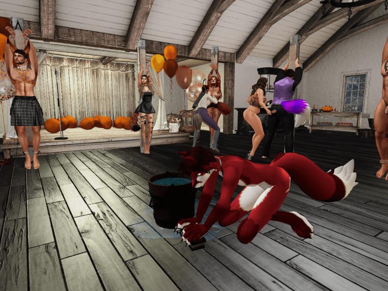 After a refreshing soak in the hot tub, the Huntrixes hauled their catches to the barn. There the bruised and banged-up foxes were strung up on posts. No fox escaped a full inspection or proper skinning (err… stripping) at the hands of their Huntrix. A fair amount of tenderizing also occurred, as tradition demands.